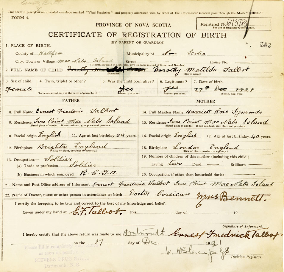 21. Name and Post Office address of Informant Ernest Frederic Talbot Ives Points, MacNabs Island