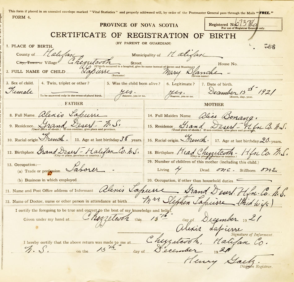 21. Name and Post Office address of Informant Alexis Lapierre Grand Desert, Hfx.