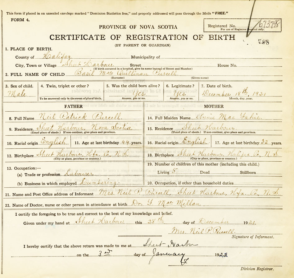 21. Name and Post Office address of Informant Mrs Neil P. Purcell Sheet Harbour, Halifax