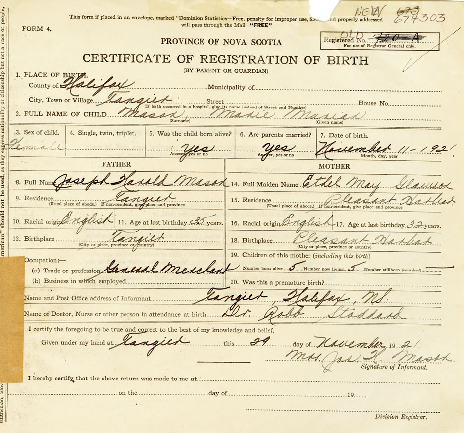 21. Name and Post Office address of Informant Mrs Jos H Mason Tangier, Halifax