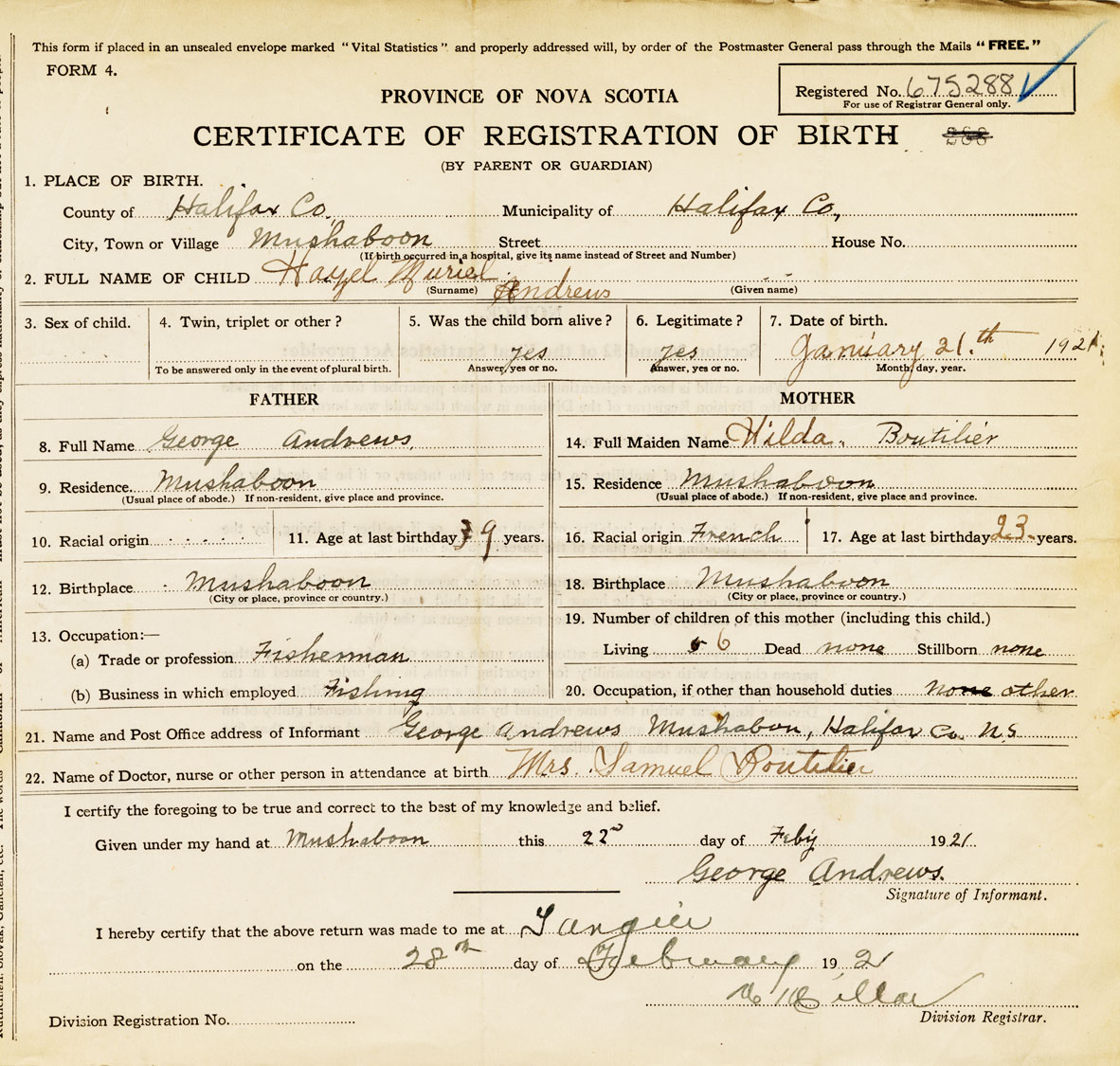 22. Name of Doctor, nurse or other person in attendance at birth Mrs. Samuel Boutilier