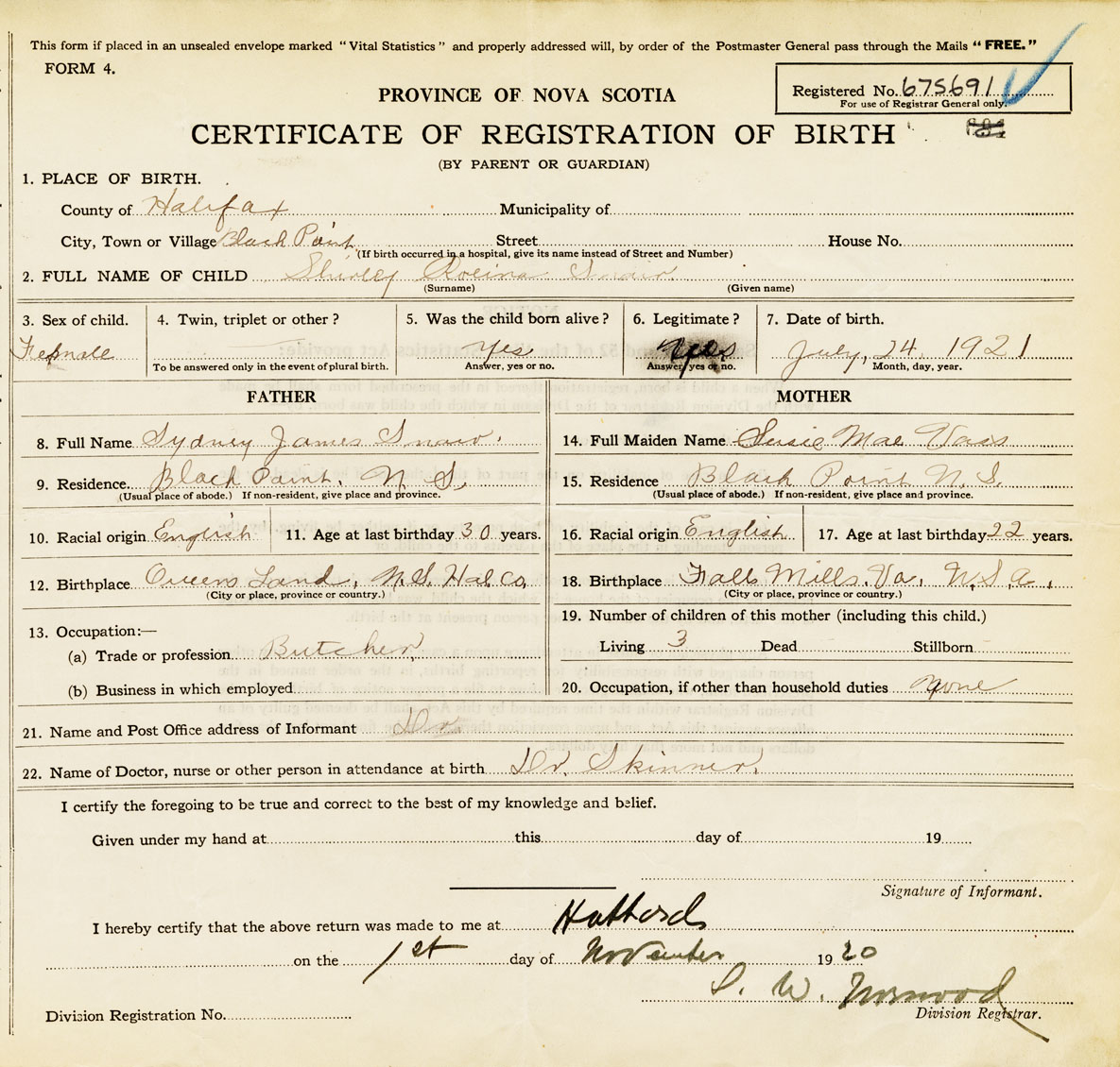 Female Birth Registration: Year: 1921 number: 67500691