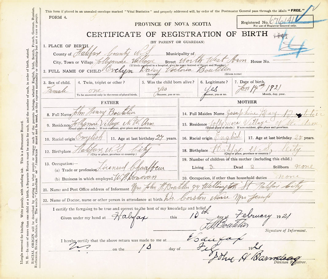 21. Name and Post Office address of Informant Mrs. John H. Boutilier 94 Wellington St. Halifax