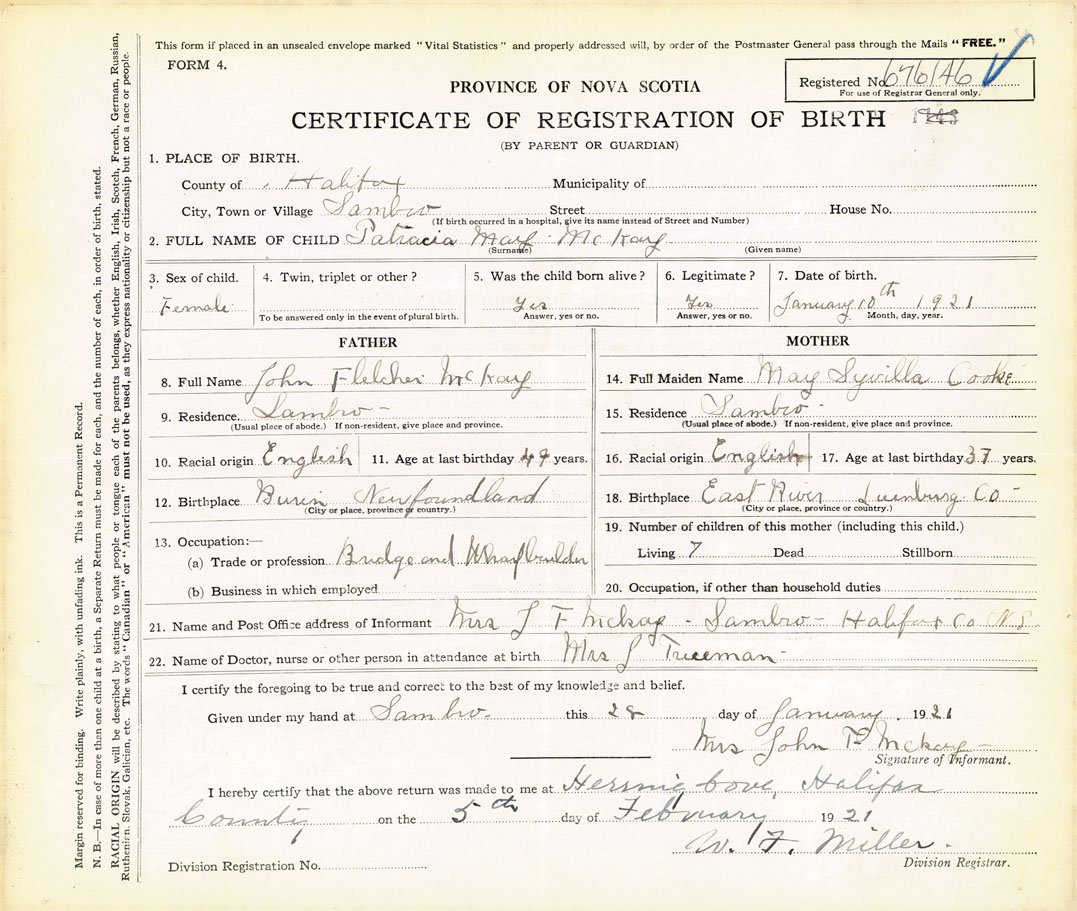 21. Name and Post Office address of Informant Mrs. J.F. McKay Sambro