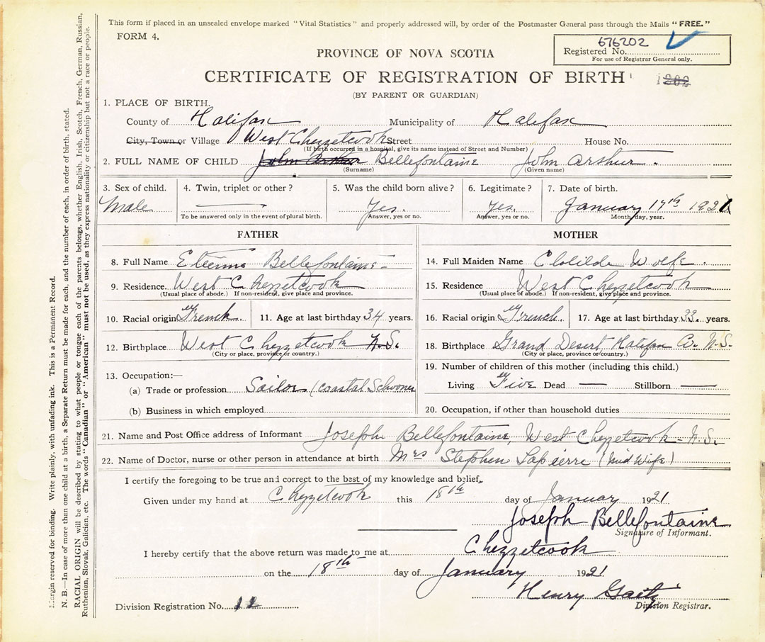 21. Name and Post Office address of Informant Joseph Bellefontaine West Chezzetcook