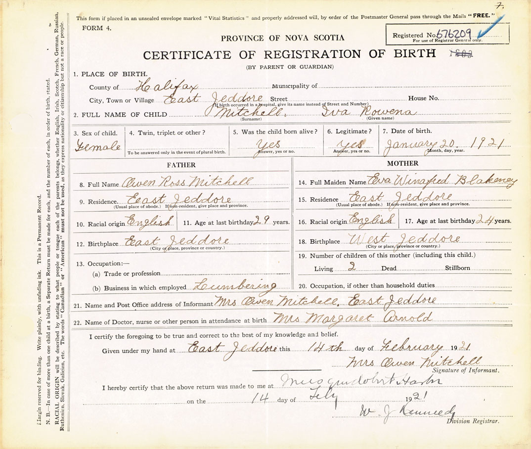 21. Name and Post Office address of Informant Mrs Owen Mitchell East Jeddore