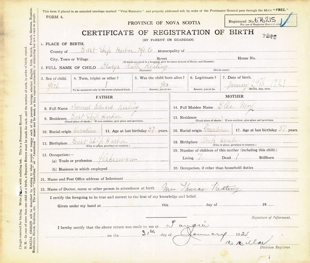 Female Birth Registration: Year: 1921 number: 67600215