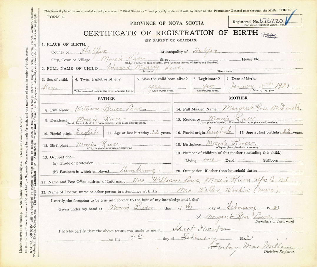 21. Name and Post Office address of Informant Mrs. William Lowe Mosers River, Hfx.
