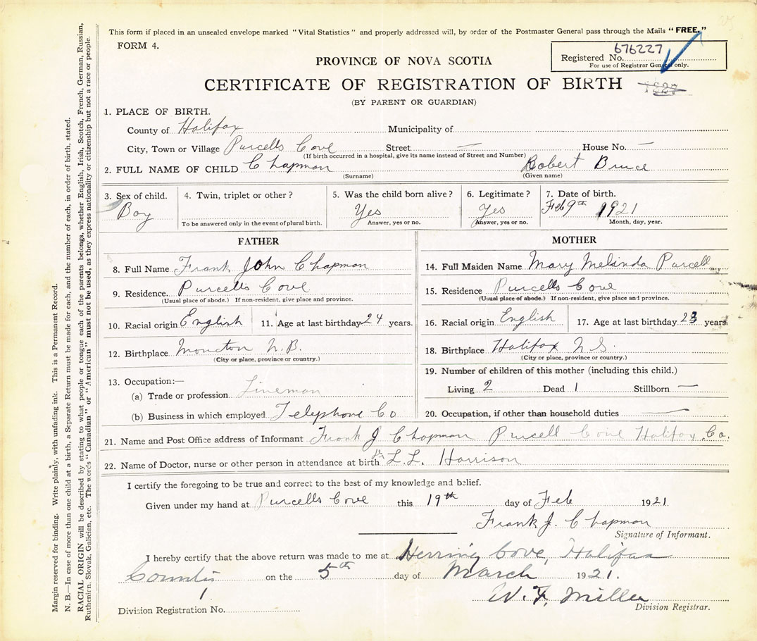 21. Name and Post Office address of Informant Frank J. Chapman Purcell Cove, Halifax