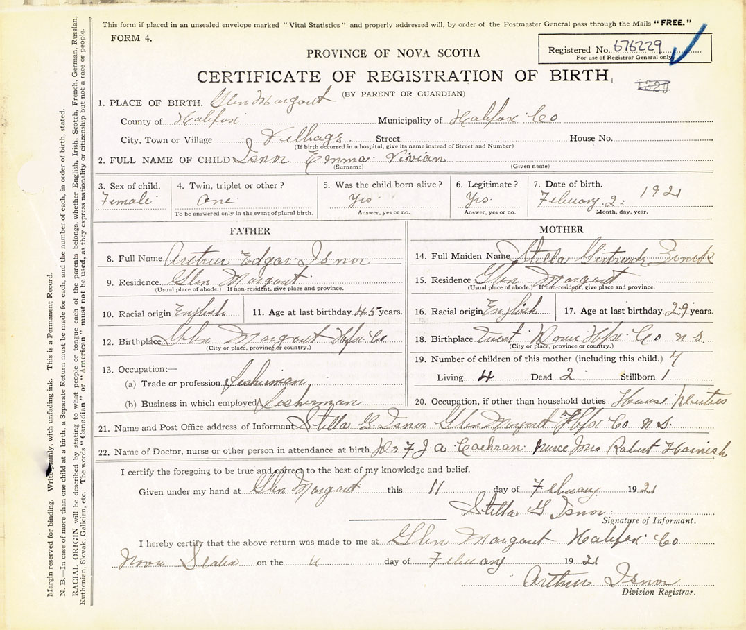 21. Name and Post Office address of Informant Stella G. Isnor Glen Margaret, Hfx.
