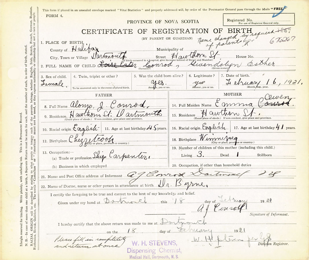 2. FULL NAME OF CHILD Conrod, Gwendolyn Esther