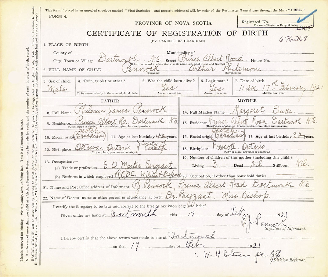 21. Name and Post Office address of Informant P J Pennock Prince Albert Road Dartmouth