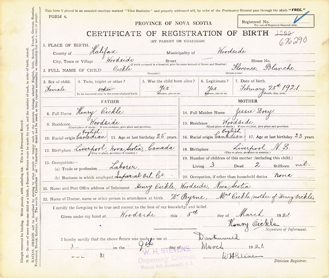 22. Name of Doctor, nurse or other person in attendance at birth Dr. Byrne, Mrs. Oickle (mother of Henry Oickle)