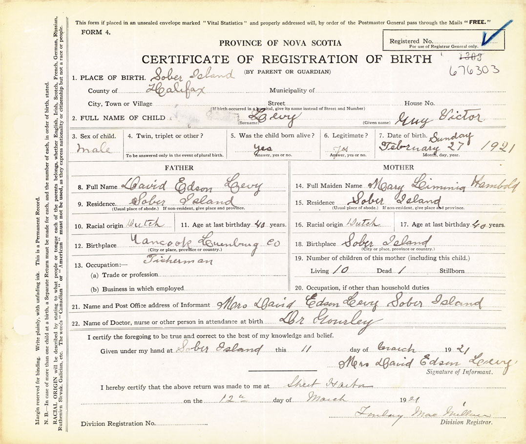 21. Name and Post Office address of Informant Mrs David Edson Levy Sober Island