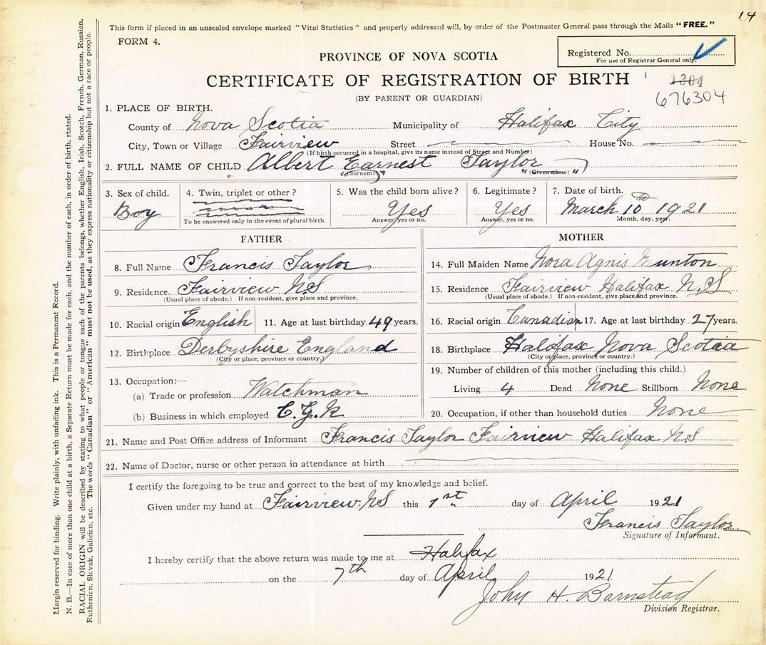 21. Name and Post Office address of Informant Francis Taylor Fairview Halifax