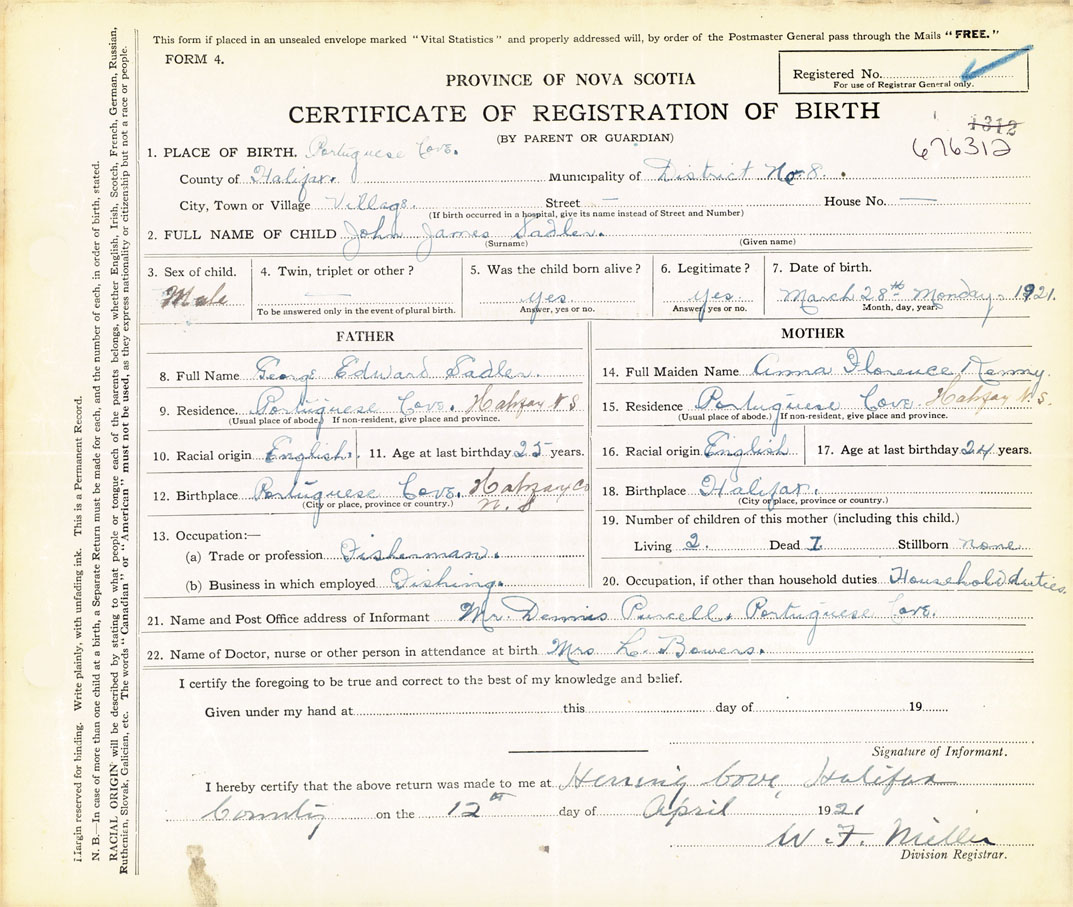 12. Birthplace Portuguese Cove, Halifax N. S.