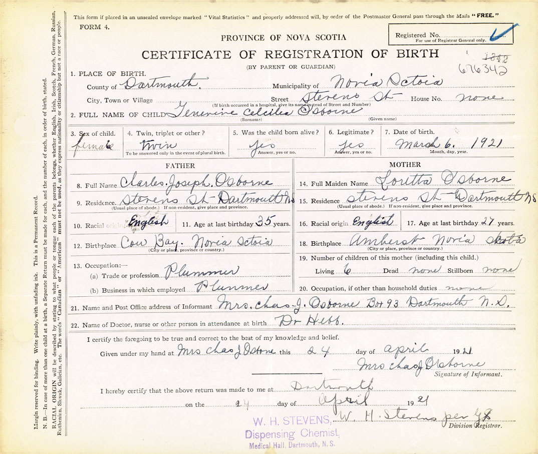 21. Name and Post Office address of Informant Mrs. Chas. J. Osborne Box 93 Dartmouth N.S.