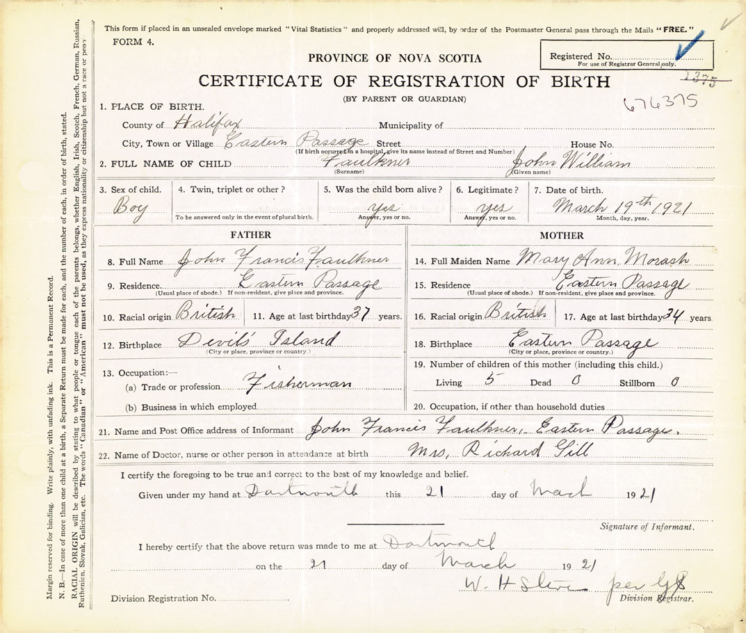 21. Name and Post Office address of Informant John Francis Faulkner Eastern Passage