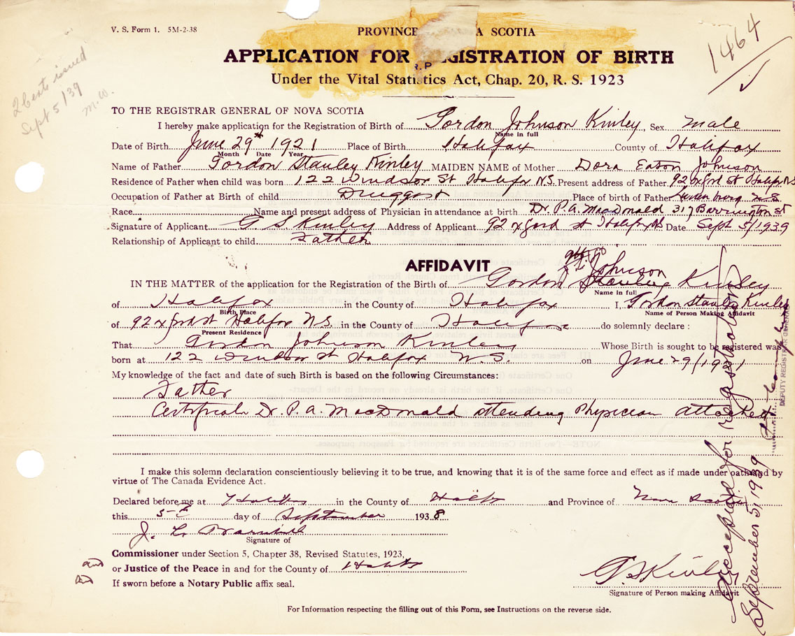 Signature of Applicant G.S. Kinley Address of Applicant 92 Oxford St. Halifax Date 5 September 1939