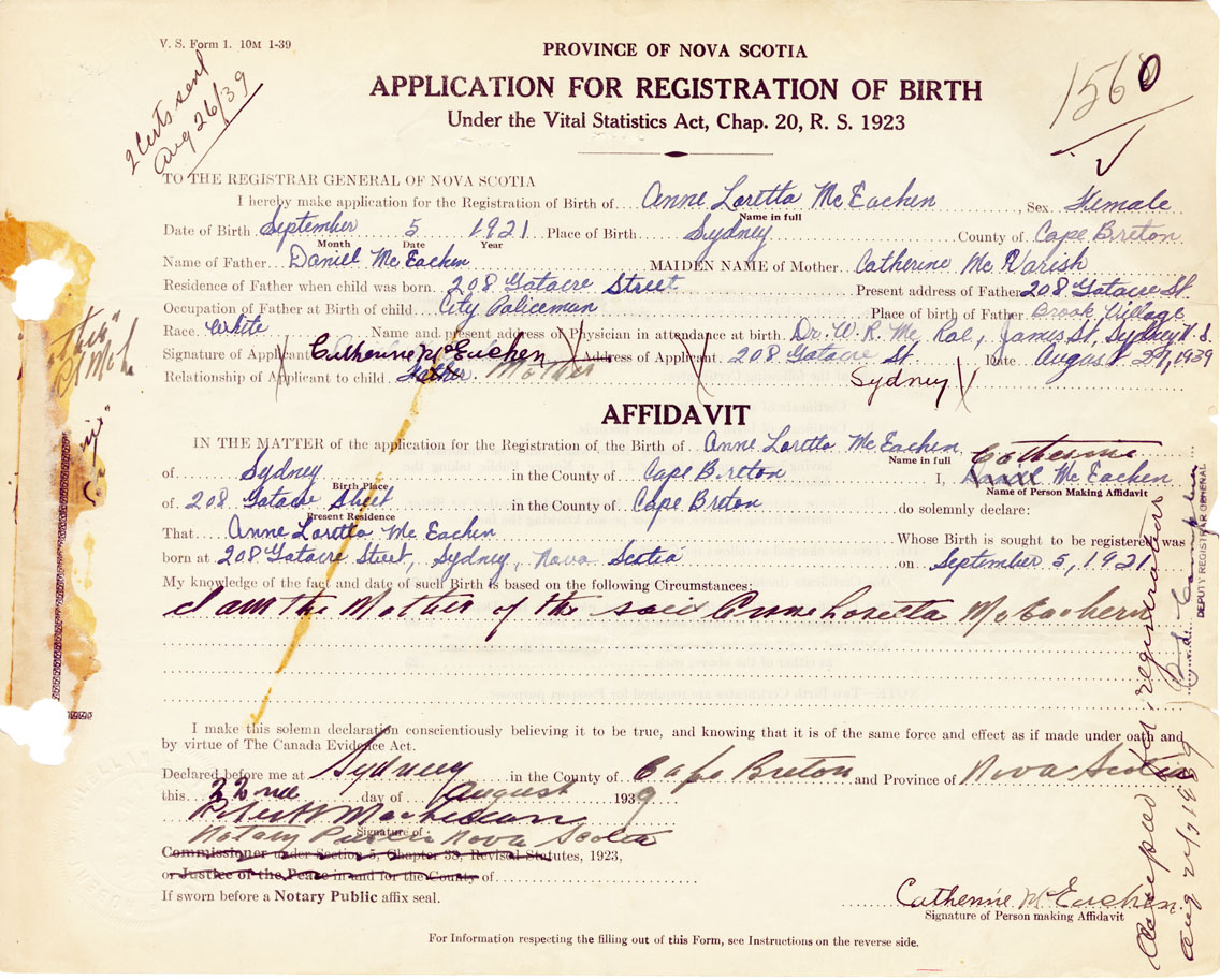 I hereby make application for the Registration of Birth of Anne LorettaMcEachern Sex Female