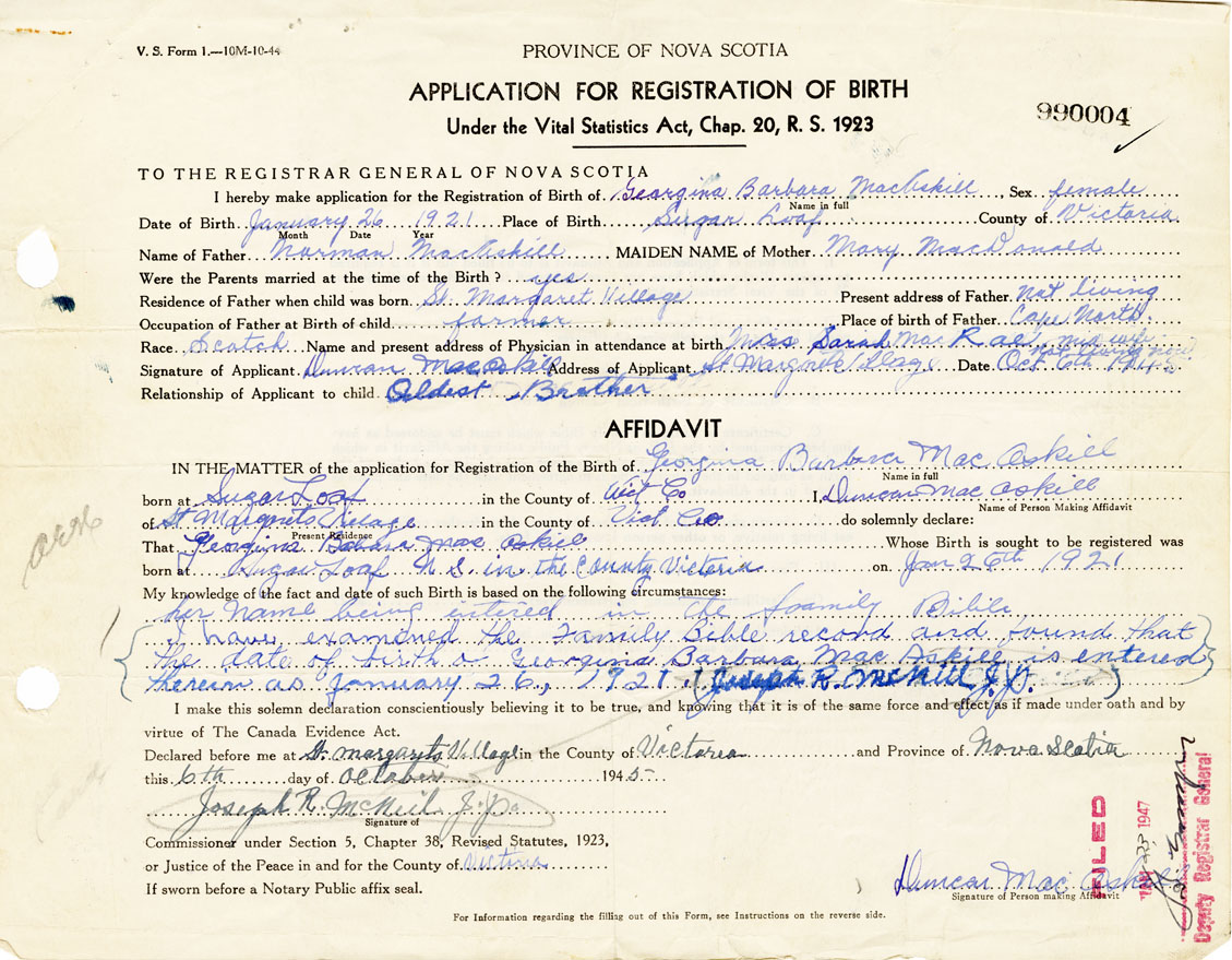 her name being entered in the family Bible I have examined the Family Bible record and found that the date of birth of Georgina Barbara MacAskill is entered therein as January 26, 1921. Joseph R. McNeil J.P.