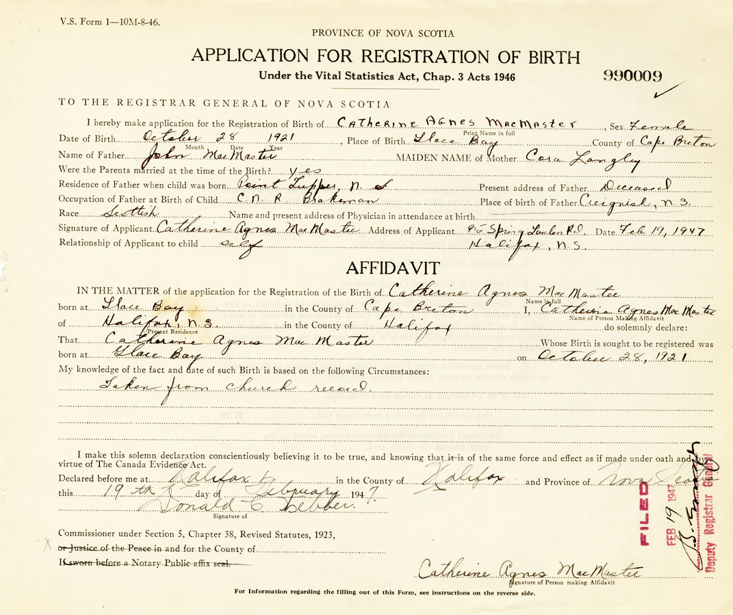 21. Name and Post Office address of Informant Catherine Agnes MacMaster 95 Spring Garden Rd. Halifax