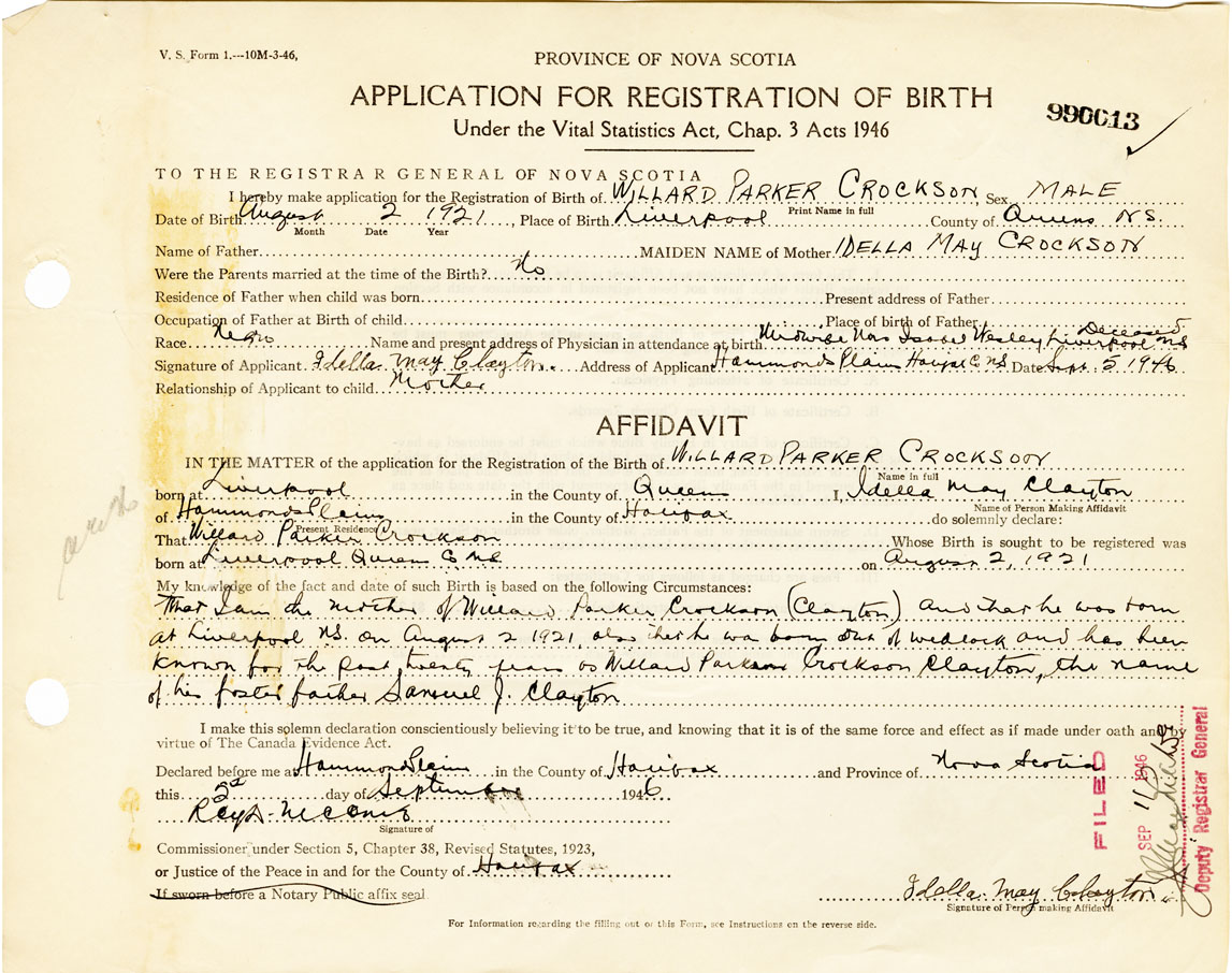 That I am the Mother of Willard Parker Crockson (Clayton) and that he was born at Liverpool on August 2, 1921 also he was born out of wedlock and has been known for the past twenty years as William Parker Crockson Clayton, the name of his foster father Samuel J. Clayton.