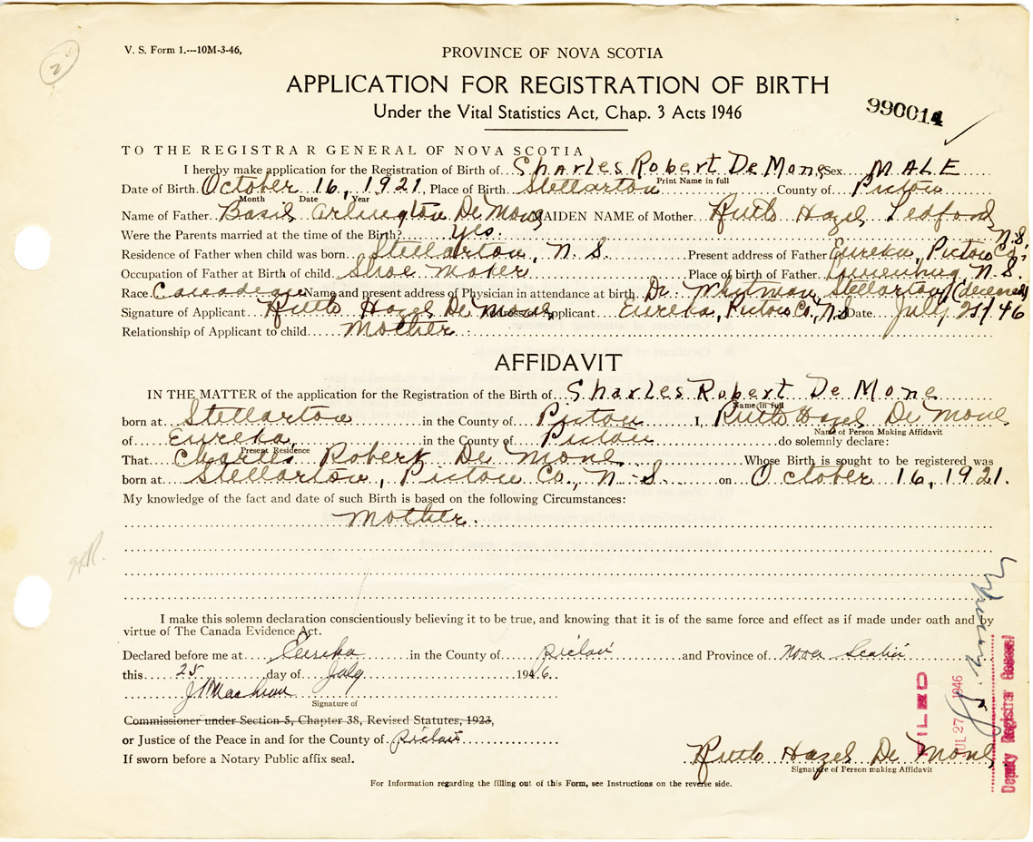 Date of Birth October 16, 1921 Place of Birth StellartonCounty of Pictou