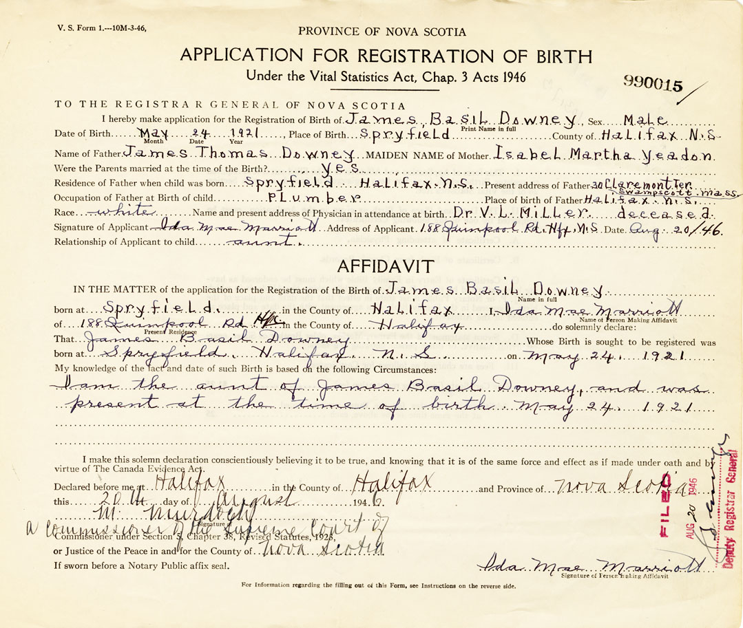 I hereby make application for the Registration of Birth of James BasilDowney Sex Male