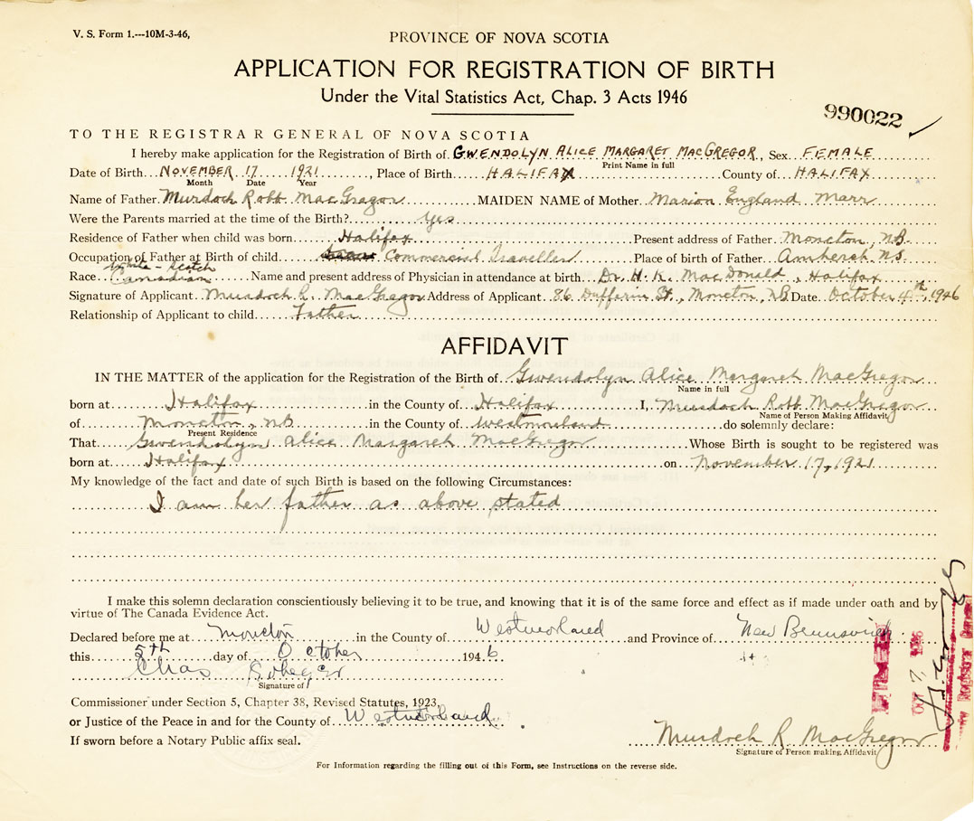 I hereby make application for the Registration of Birth of Gwendolyn Alice MargaretMacGregor Sex Female