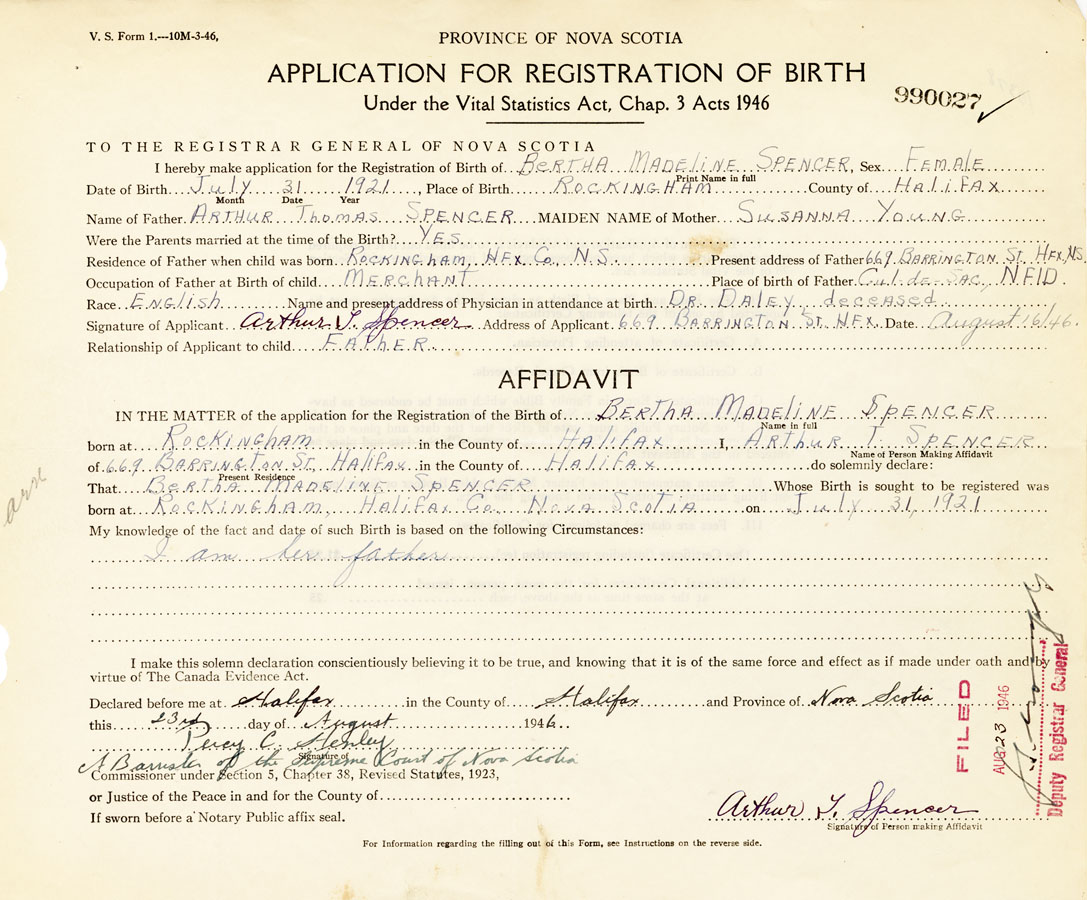 Signature of Applicant Arthur T. Spencer Address of Applicant 669 Barrington St. Halifax Date August 16, 1946