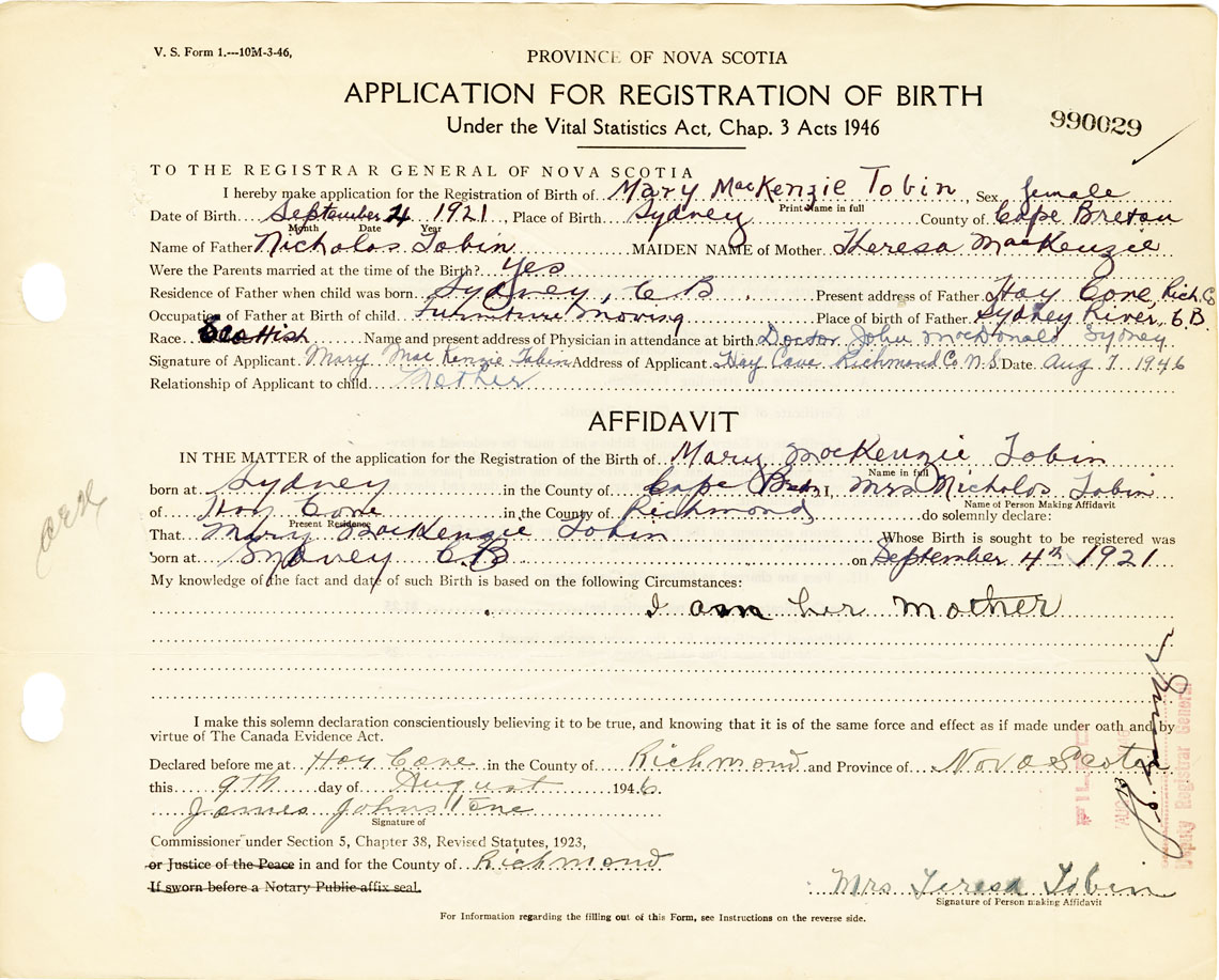 Signature of Applicant Mary MacKenzie Tobin Address of Applicant Hay Cove Date August 7, 1946
