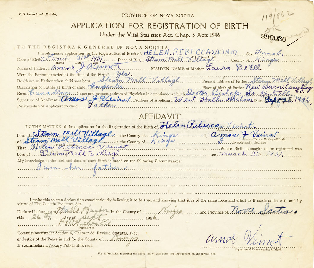 I hereby make application for the Registration of Birth of Helen RebeccaVeinot Sex Female