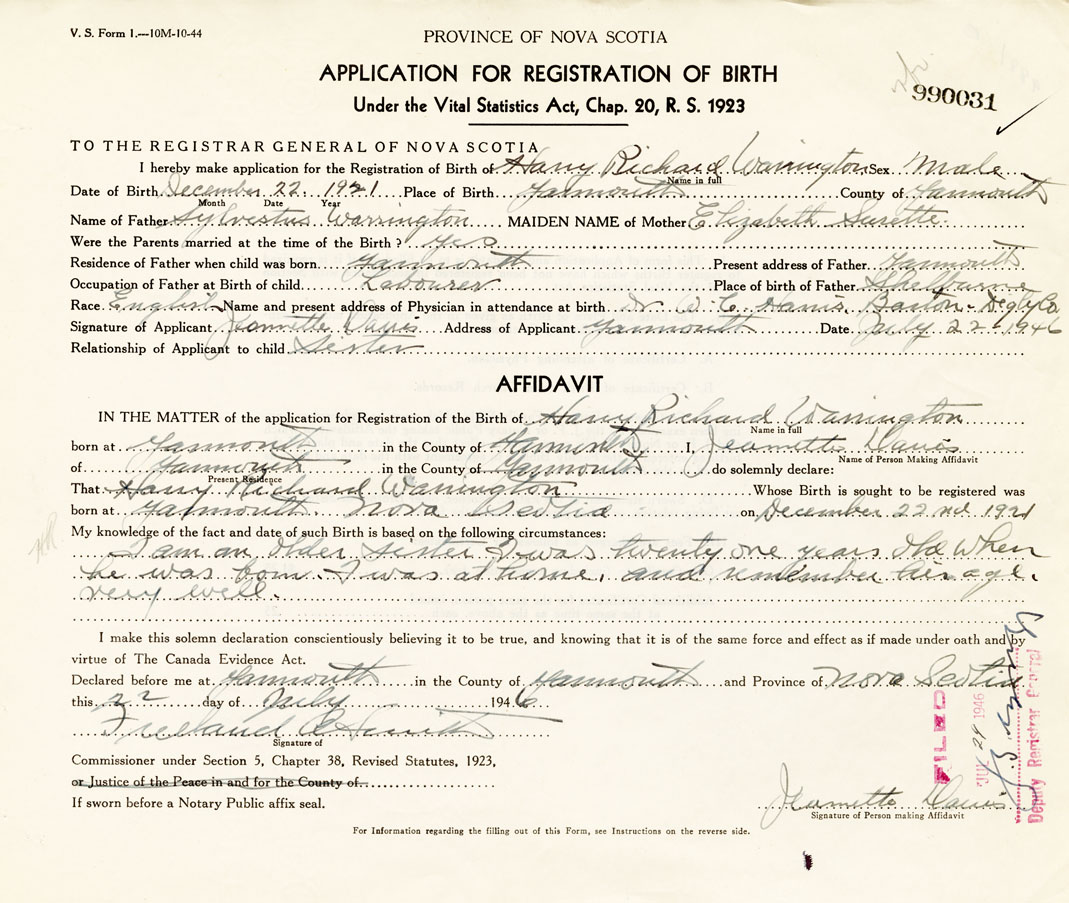 I hereby make application for the Registration of Birth of Harry RichardWarrington Sex Male