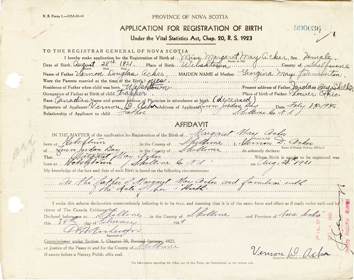 IN THE MATTER of the application for the Registration of the Birth of Margaret MayAcker
