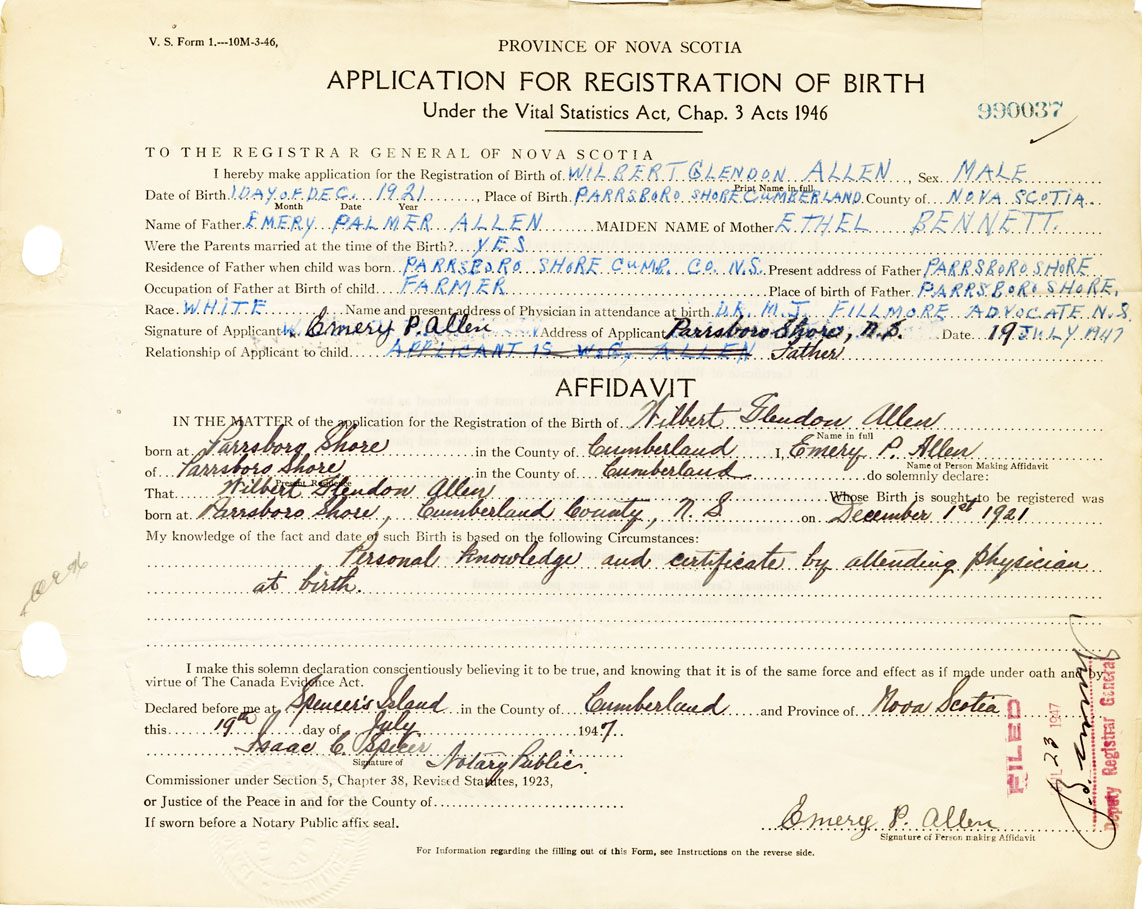 I hereby make application for the Registration of Birth of Wilbert GlendonAllen Sex Male