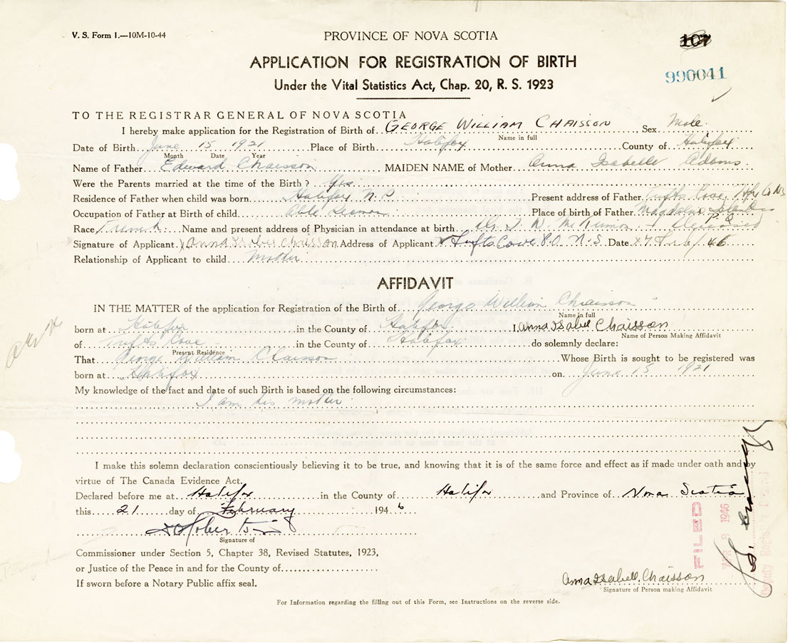 I hereby make application for the Registration of Birth of George WilliamChaisson Sex Male