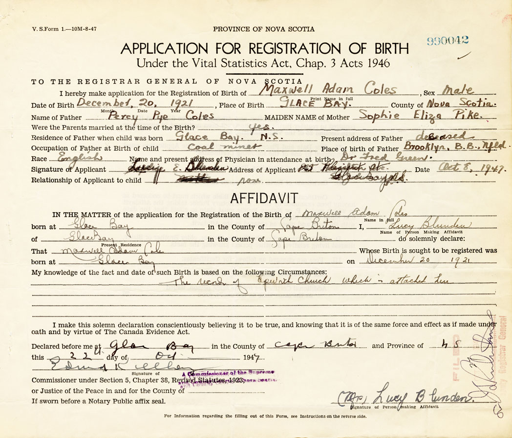 IN THE MATTER of the application for the Registration of the Birth of Maxwell AdamColes