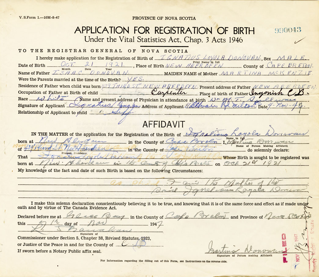 Signature of Applicant Ignatius Donovan Address of Applicant 11 Belvair Rd. Milton Date November 4, 1946