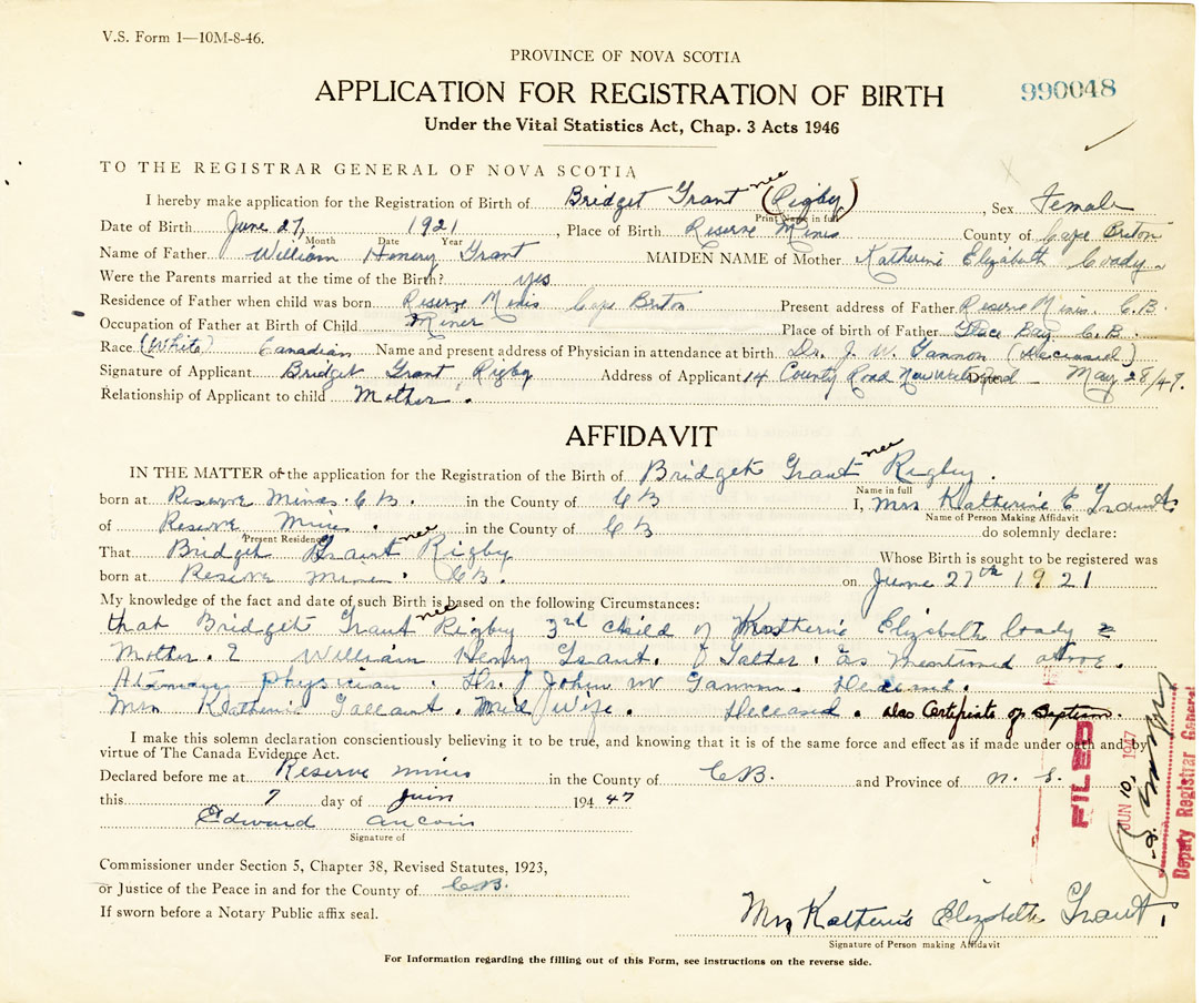 Signature of Applicant Bridget Grant Rigby Address of Applicant 14 County Road New Waterford Date May 28, 1947