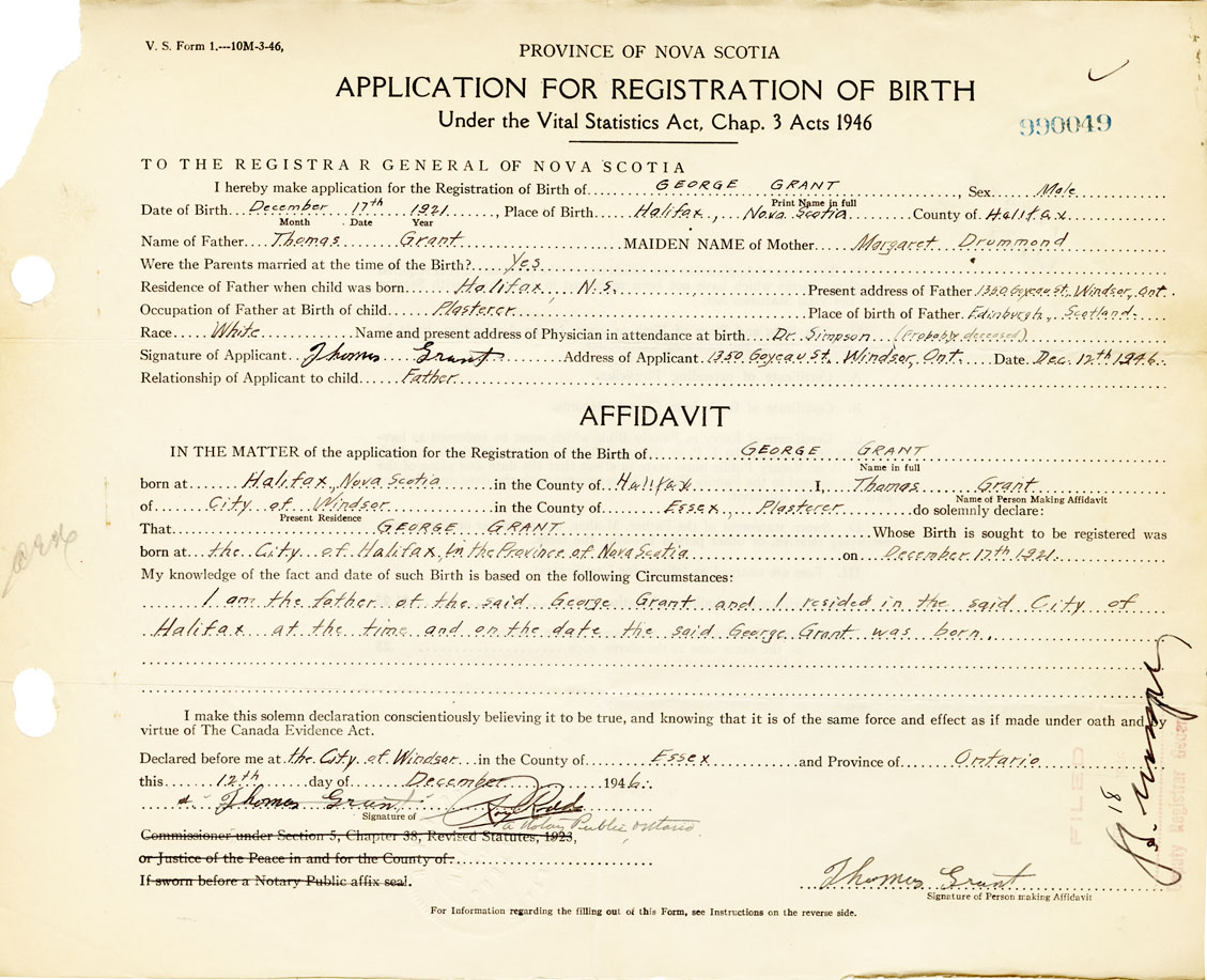 I am the father of the said George Grant and I resided in the said City of Halifax at the time and on the date the said George Grant was born.