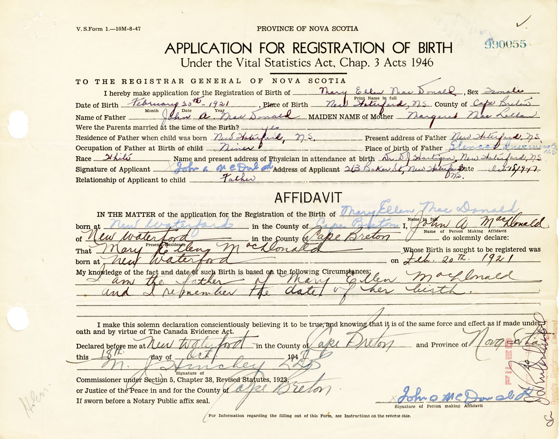 Date of Birth February 20, 1921 Place of Birth New WaterfordCounty of Cape Breton