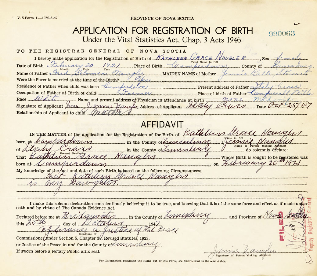 I hereby make application for the Registration of Birth of Kathleen GraceNaugler Sex Female