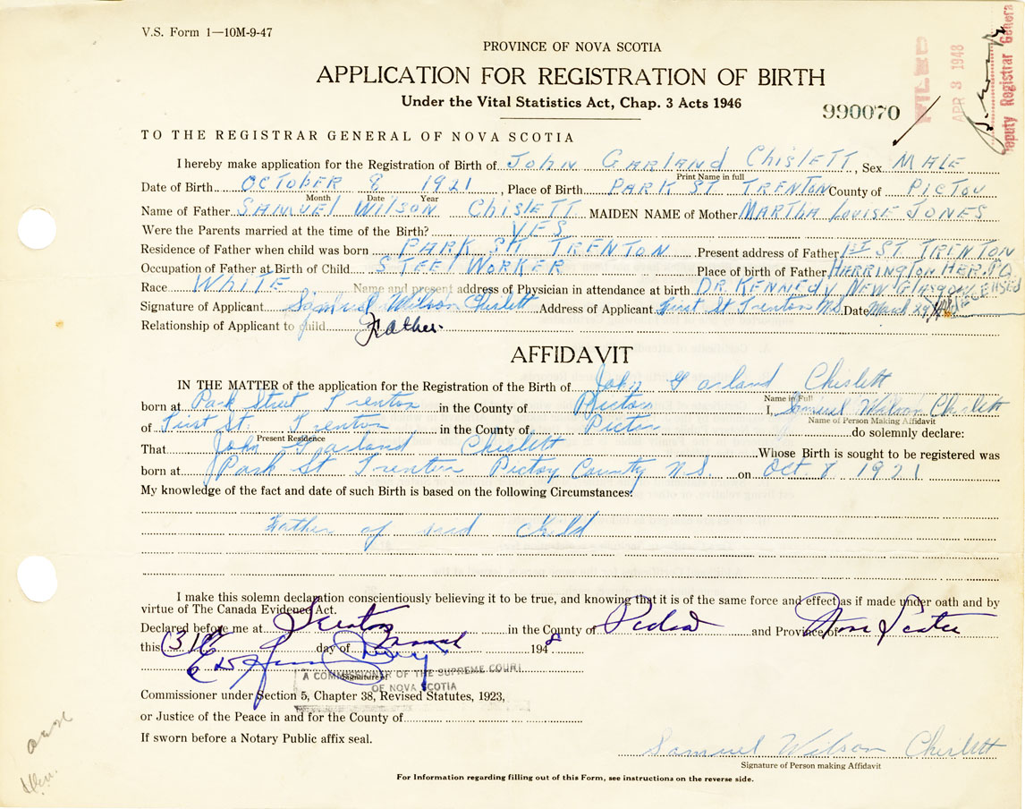 I hereby make application for the Registration of Birth of John GarlandChislett Sex Male