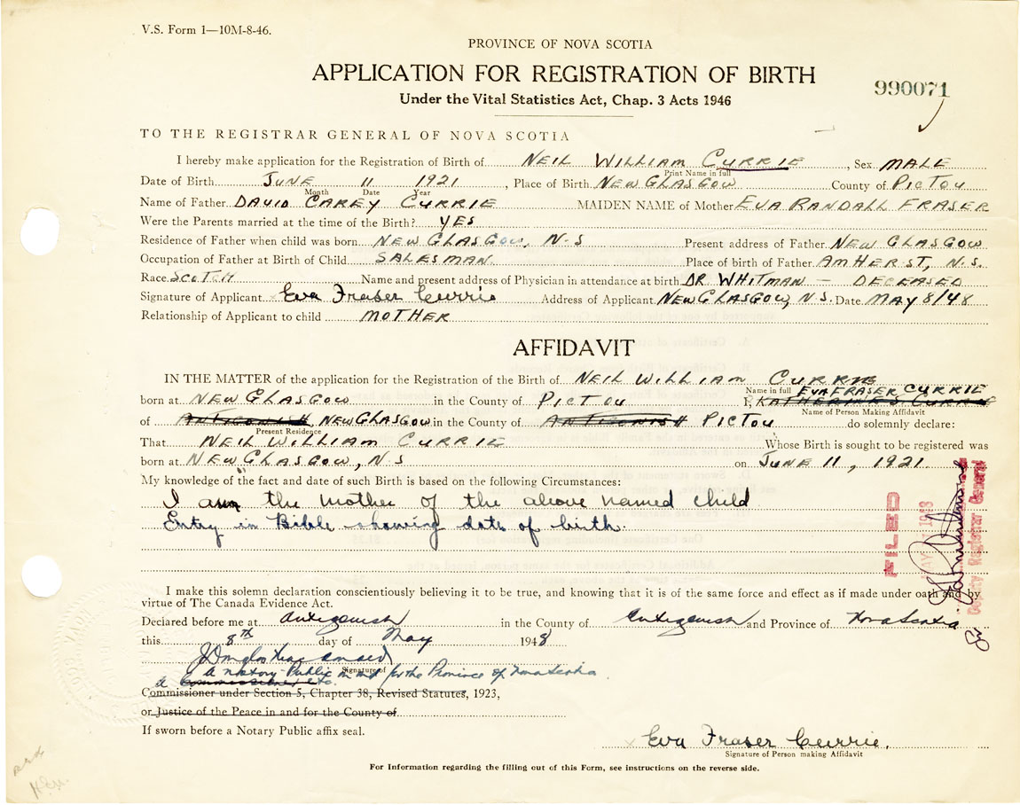 I hereby make application for the Registration of Birth of Neil WilliamCurrie Sex Male