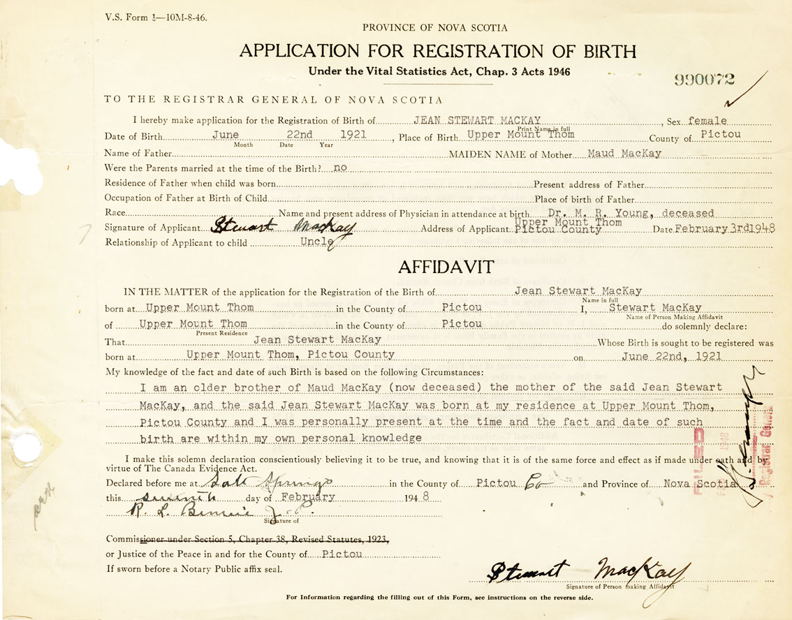 I am an older brother of Maud MacKay (now deceased) the mother of the said Jean Stewart MacKay, and the said Jean Stewart MacKay was born at my residence at Upper Mount Thom, Pictou County and I was personally present at the time and the fact and date of such birth are within my own personal knowledge.