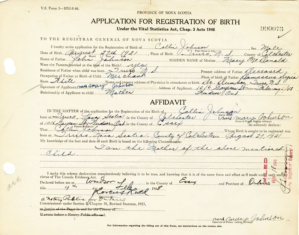 I hereby make application for the Registration of Birth of CollinJohnson Sex Male