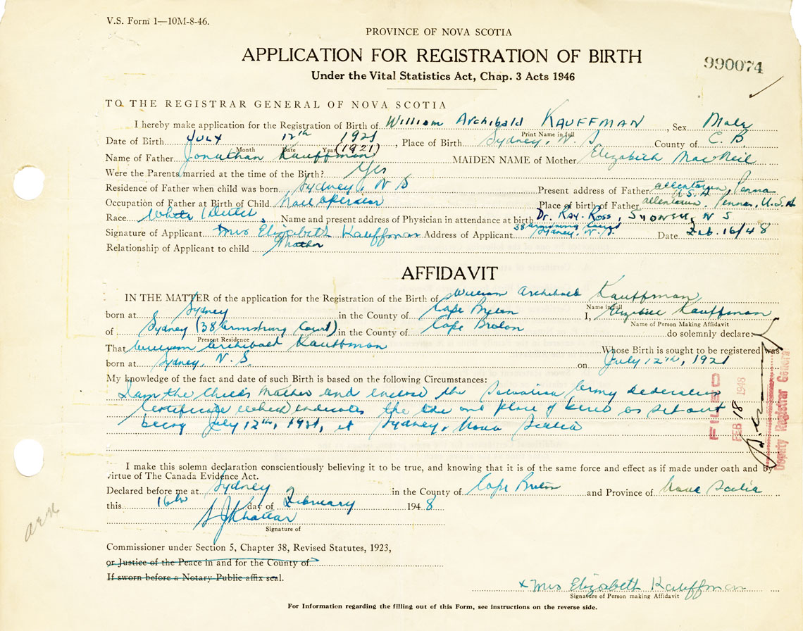 I hereby make application for the Registration of Birth of William ArchibaldKauffman Sex Male