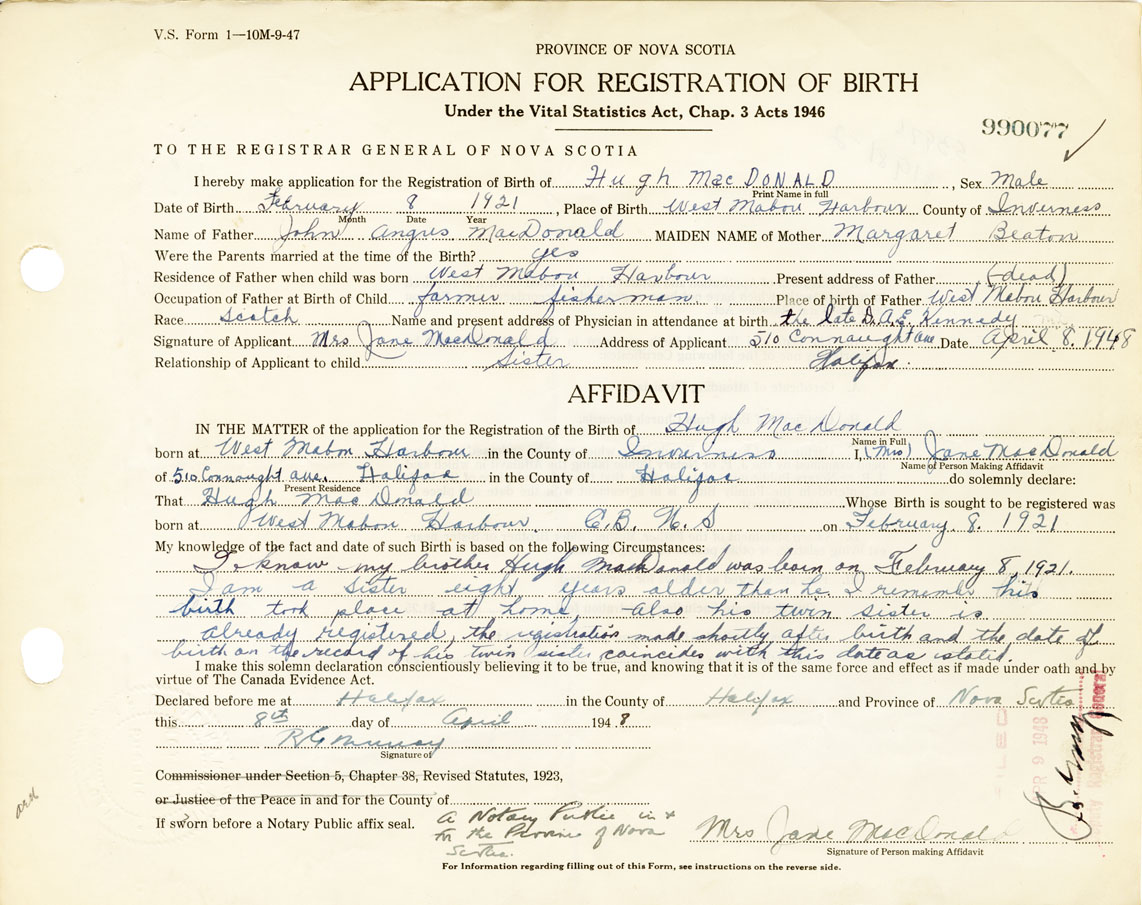 I know my brother Hugh MacDonald was born on February 8, 1921. I am a sister eight years older than he I remember this birth took place at home. Also his twin sister is already registered, the registration made shortly after birth and the date of birtha s the record of his twin sister coincides with this date as stated.