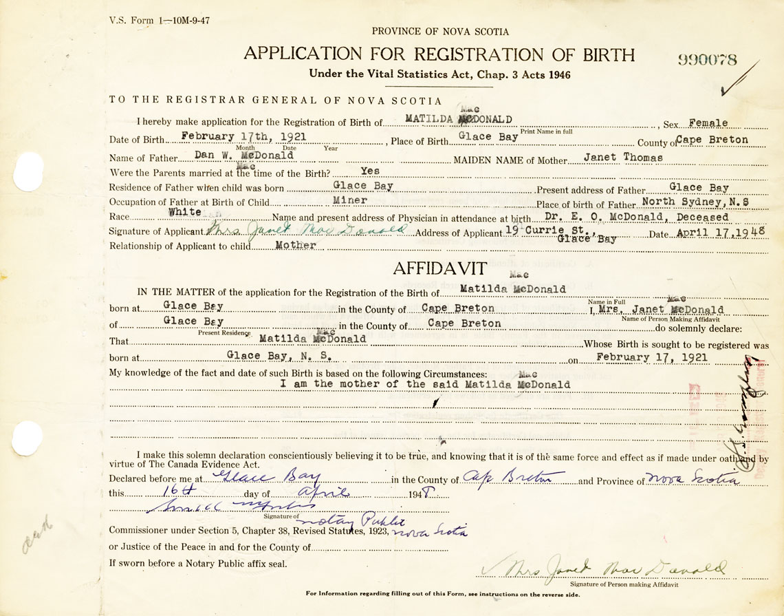 Signature of Applicant Mrs. Janet MacDonald Address of Applicant 19 Currie St. Glace Bay Date April 17, 1948